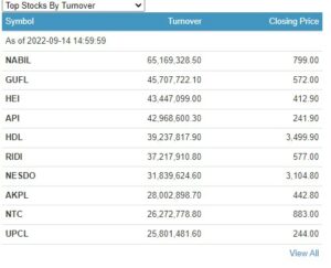 १ अर्ब ४५ करोड ३८ लाख २४ हजार रुपैयाँको शेयर कारोबार हुँदा सबैभन्दा धेरै नबिल बैंकको शेयर कारोबार भएको छ । आज बैंकको ६ करोड ५१ लाख रुपैयाँको शेयर कारोबार भएको छ भने गुर्खाज फाइनान्सको ४ करोड ५७ लाख रुपैयाँको शेयर कारोबार भएको छ । हिमालयन एभरेष्ट एन्स्योरेन्सको ४ करोड ३४ लाख रुपैयाँको शेयर कारोबार भएको छ भने अपि पावरको ४ करोड २९ लाख रुपैयाँको शेयर कारोबार भएको छ ।