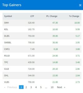 यसैगरी आज कालिञ्चोक दर्शनको शेयर ९.९९ प्रतिशले बृद्धि भई प्रति शेयर मूल्य १८२ रुपैयाँ कायम भएको छ भने धौलागिरी लघुवित्त वित्तीय संस्थाको शेयर ५.१७ प्रतिशतले बृद्धि भई प्रति शेयर मूल्य ७९३ रुपैयाँ कायम भएको छ । आज स्वाभलम्बन लघुवित्त वित्तीय संस्थाको शेयर ३.९५ प्रतिशतले बृद्धि भई प्रति शेयर मूल्य ७९० रुपैयाँ कायम भएको छ ।