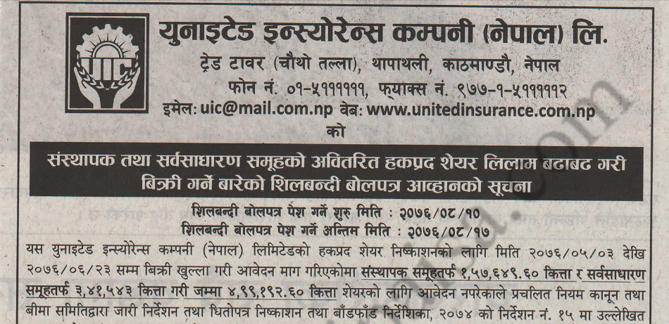 कम्पनीले गत भदौ ३ गतेदेखि असोज २३ गतेसम्म ७२ लाख ५७ हजार ६०० कित्ता (२४० प्रतिशत) हकप्रद सेयर बिक्री गरेको थियो । यसको न्यूनतम अंकित मूल्य १ सय रुपैयाँ तोकिएको छ । लगानीकर्ताले न्यूनतम १ सय रुपैयाँलाई आधार मानेर बोलकबोल गर्नुपर्छ । यसमा एनएमबि क्यापिटल नागपोखरी काठमाडौंबाट आवेदन दिन सकिनेछ ।