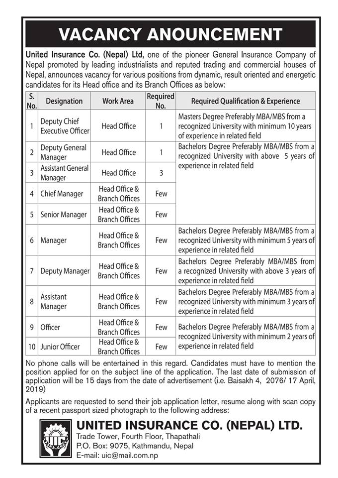 युनाइटेड इन्स्योरेन्स कम्पनीले विभिन्न पदका कर्मचारी माग गरेको छ । कम्पनीले प्रधान कार्यालयका लागि डेपुटि सिइओ १ जना, डेपुटि जनरल म्यानेजर १ जना र असिस्टेन्ट जनरल म्यानेजर ३ जना माग गरेको छ । यस्तै कम्पनीले चिफ म्यानेजर , सिनियर म्यानेजर, म्यानेजर, डेपुटि म्यानेजर, असिस्टेन्ट म्यानेजर, अफिसर र जुनियर अफिसर पदका लागि केही कर्मचारी माग गरेको छ ।