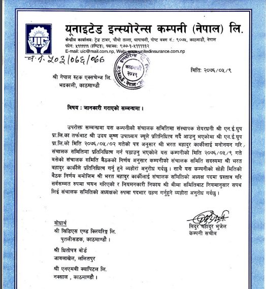 नयाँ सञ्चालक नियुक्त भएको सम्बन्धमा कम्पनीले सञ्चालक समितिमा संस्थापक तर्फबाट प्रतिनिधित्व गर्ने गरी मनोनय गरेको हो । कम्पनीको भदौ ९ गते बसेको सञ्चालक समितिको बैठकले संचालक समितिको सदस्यमा भरत बहादुर कार्कीलाई चयन गरेको कम्पनीले जनाएको छ ।