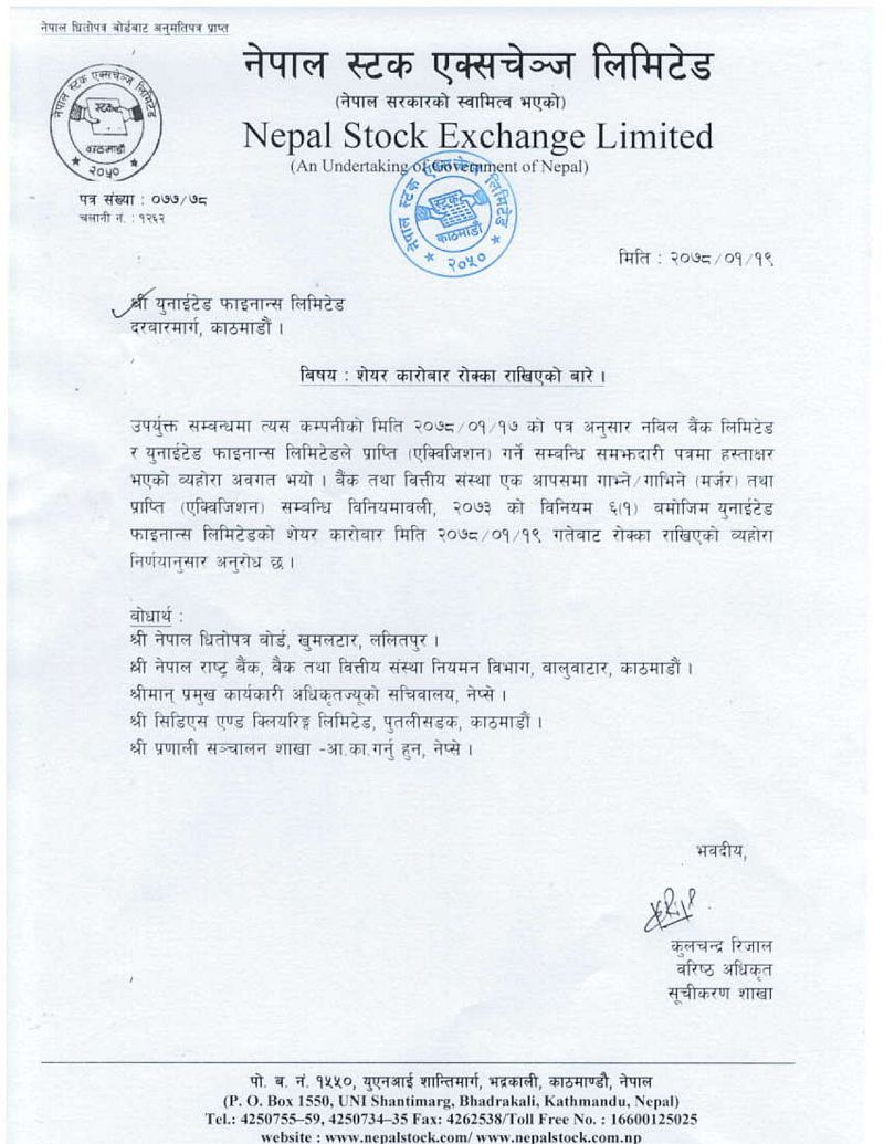 काठमाडौं । युनाईटेड फाइनान्स लिमिटेडको शेयर कारोबार रोक्का भएको छ । कम्पनीलाई नबिल बैंकले प्राप्ति गर्ने सम्झौता भएसँगै शेयर कारोबार आजदेखि रोक्का भएको जनाएको छ ।