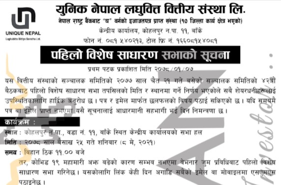 काठमाडौं । युनिक नेपाल लघुवित्त वित्तीय संस्था लिमिटेडले पहिलो विशेष साधारण सभा बैशाख २५ गते गर्ने भएको छ । कम्पनीले आफ्नै केन्द्रिय कार्यालयको सभा हल, बाँकेमा बिहान ११ बजे सभा गर्ने जनाएको छ । कम्पनीको चैत २१ गते बसेको सञ्चालक समितिको बैठकले सभा गर्ने निर्णय गरेको हो ।