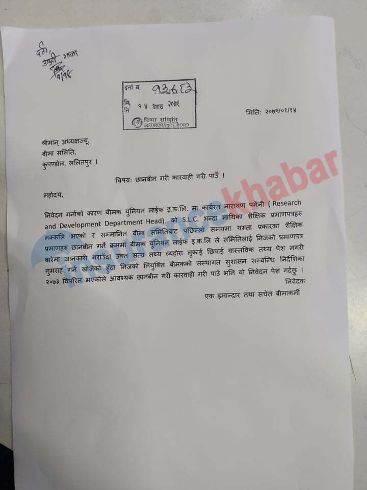 काठमाडौं । बीमा समितिमा युनियन लाइफका अनुसन्धान विभाग ‘Research And Development Department’ प्रमुख नारायण पंगेनीको नक्कली शैक्षिक प्रमाणपत्रको विषयमा उजुरी परेको छ । कम्पनीमा कार्यरत पंगेनीको एसएलसी भन्दा माथिका शैक्षिक प्रमाणपत्रहरु नक्कली भएको भन्दै छानवीन गरी कारवाही गरी पाउ भन्दै समितिमा बेनामी उजुरी परेको हो ।