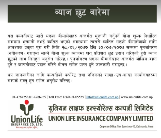 काठमाडौं । युनियन लाइफ इन्स्योरेन्स कम्पनी लिमिटेडले व्यतित बीमालेख नविकरण गर्दा ब्याज छुट दिने भएको छ ।कम्पनीबाट जारी भएका र विभिन्न कारणले बीमाशुल्क तिर्न बाँकी भई म्याद नाघेका व्यतित बीमालेख पुर्नजागरण गर्दा शतप्रतिशत छुट दिने जनाएको छ ।कम्पनीले चालु आर्थिक बर्षको कात्तिक मसान्तसम्ममा पुर्नजागरण गराउने बीमितहरुलाई लाग्ने ब्याजमा शतप्रतिशत छुट दिने जनाएको छ ।