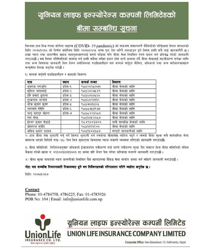 काठमाडौं । युनियन लाइफ इन्स्योरेन्सले कोरोना भाइरसको महामारीका कारण बन्द रहेको कार्यालयलाई डिजिटल कार्यालयमा रुपान्तरण गर्दै ७ वटै प्रदेशका पदाधिकारीहरुको सम्पर्क नम्वर सार्वजनिक गरेको छ ।