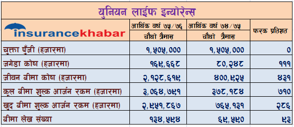 नयाँ जीवन बीमा कम्पनी मध्यको एक युनियन लाईफ इन्स्योरेन्सले आर्थिक वर्ष ७५/७६ को चौथो त्रैमास सम्मको वित्तिय विवरण सार्वजनिक गरेको छ। कम्पनीले आर्थिक वर्ष ७५/७६ मा ३ अर्ब ६ करोड कुल बीमा शुल्क आर्जन गरेको छ भने २ अर्ब ९५ करोड खुद बीमा शुल्क आर्जन गरेको छ।