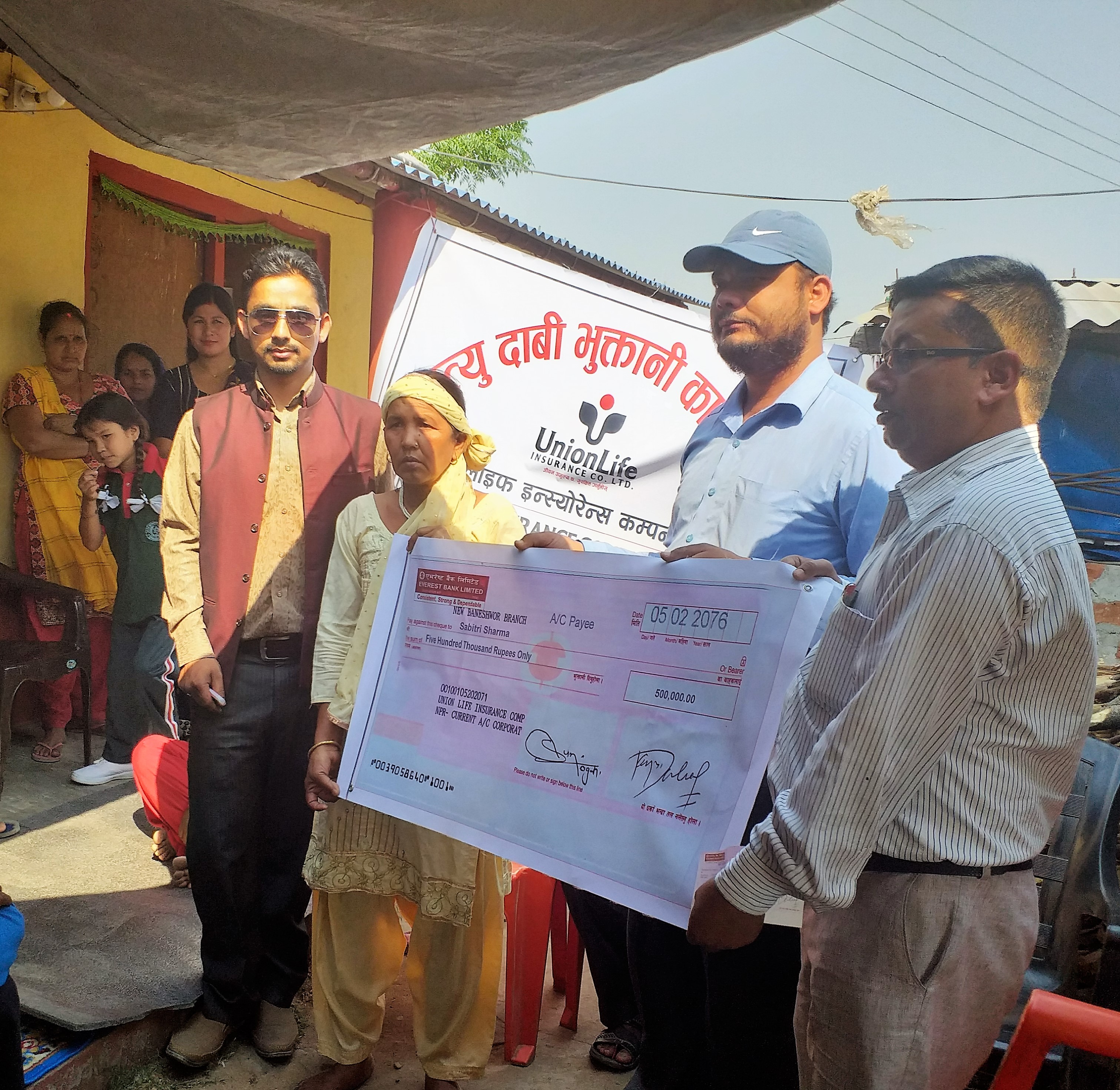 युनियन लाईफ कम्पनिले मृत्यु दाबी भुक्तानी गरेको छ । कम्पनीले बर्दिया जिल्ला बाँसगडी नगरपालिका १ निबासी मृतक बीमित सालिग्राम सर्माको धर्मपत्नी सबित्रि शर्मालाई घरमै पुगि दाबी बापतको ५ लाख रुपैयाँ हस्तान्तरण गरेको हो ।