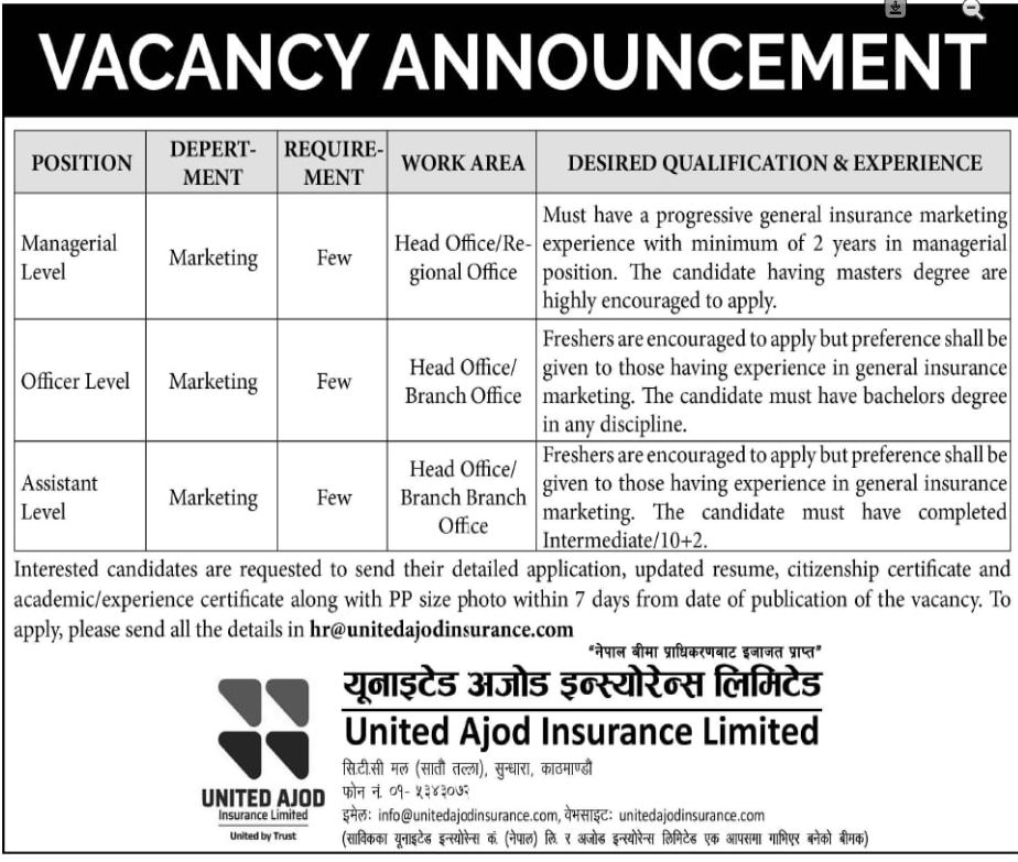 यूनाइटेड अजोड इन्स्योरेन्सले माग्यो तीन पदका लागि कर्मचारी