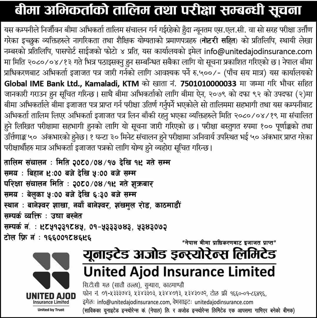 काठमाडौं । यूनाइटेड अजोड इन्स्योरेन्स कम्पनीले बीमा अभिकर्ता तालिम संचालन गर्ने भएको छ । कम्पनीले एसएलसी वा सो सरह उर्तिण गरेका ईच्छुक व्यक्तिहरुले नागरिकता तथा शैक्षिक प्रमाणपत्रको प्रतिलिपी, स्थायी लेखा नम्बरको प्रतिलिपी, पासपोर्ट साइजको फोटो ४ प्रति कम्पनीको इमेल ठेगानामा पठाउनुपर्नेछ । ईच्छुक व्यक्तिले साउन १३ गतेभित्र पठाइसक्नुपर्नेछ ।