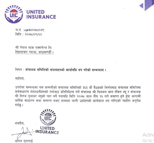 काठमाडौं । यूनाइटेड इन्स्योरेन्स कम्पनीमा सर्वसाधारण शेयरधनीको तर्फबाट प्रतिनिधित्व गर्ने दुई जना सञ्चालकहरुको कार्यावधि थप भएको छ । कम्पनीले एक सुचना जारी गर्दै सञ्चालक विलसन मान रंजित र निरज तुलाधरको चार वर्षे पदावधि पुस २६ गते समाप्त हुने भएकाले कार्यकाल थप गरेको कम्पनीले जनाएको छ ।
