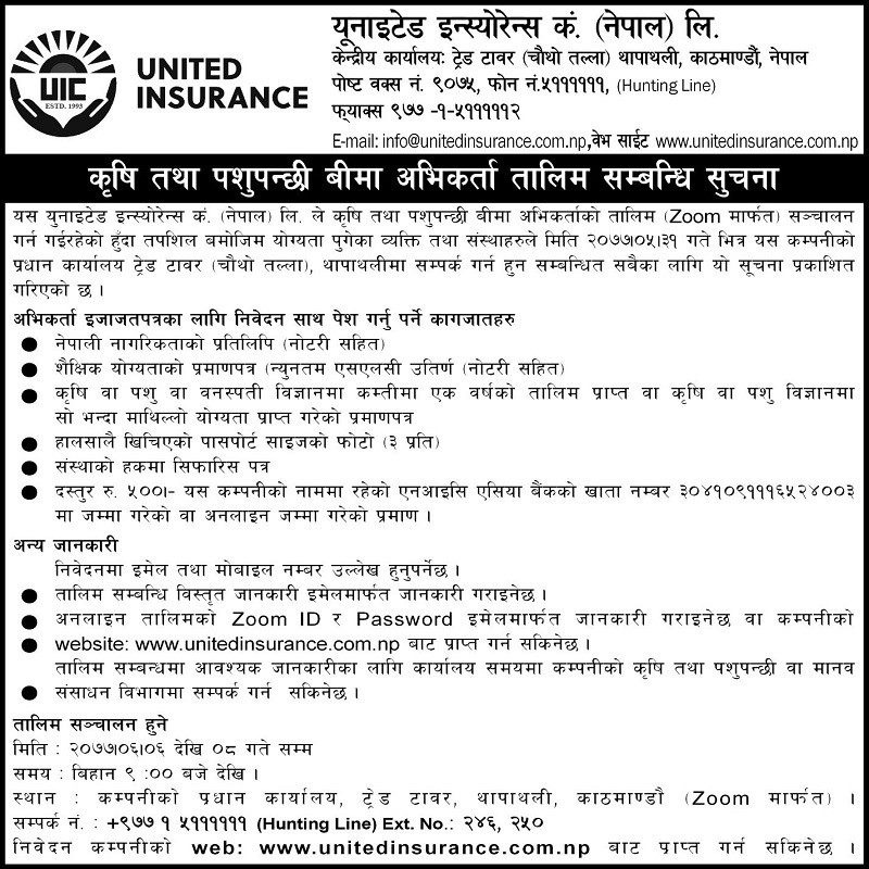 काठमाडौं । यूनाइटेड इन्स्योरेन्स कम्पनी लिमिटेडले कृषि तथा पशुपन्छि बीमा अभिकर्ता तालिम संचालन गर्ने भएको छ । उक्त तालिम असोज ६ गते देखी असोज ८ गतेसम्म संचालन हुनेछ । तालिम बिहान ९ बजेदेखी कम्पनीको प्रधान कार्यालयमा जुममार्फत हुने जनाएको छ ।