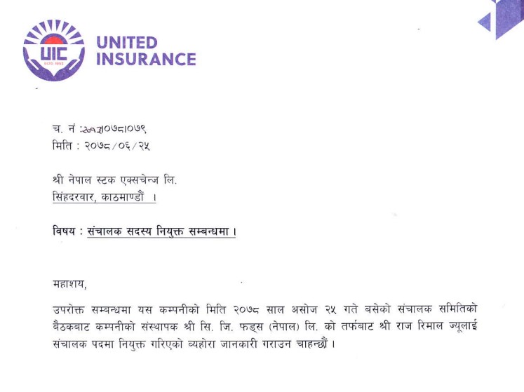 काठमाडौं । यूनाइटेड इन्स्योरेन्स कम्पनीको सञ्चालकमा राज रिमाल नियुक्त भएका छन् । कम्पनीको असोज २५ गते बसेको संचालक समितिको बैंठकले रिमाललाई कम्पनी सञ्चालकमा नियुक्त गर्ने निर्णय गरेको हो ।