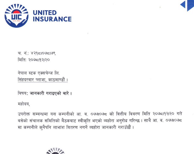 काठमाडौं । यूनाइटेड इन्स्योरेन्स कम्पनीले आफ्ना शेयरधनीलाई लाभांश वितरण नगर्ने भएको छ । कम्पनीले आर्थिक वर्ष २०७७/७८ को मुनाफाबाट कुनै पनि लाभांश वितरण नगर्ने जनाएको छ ।