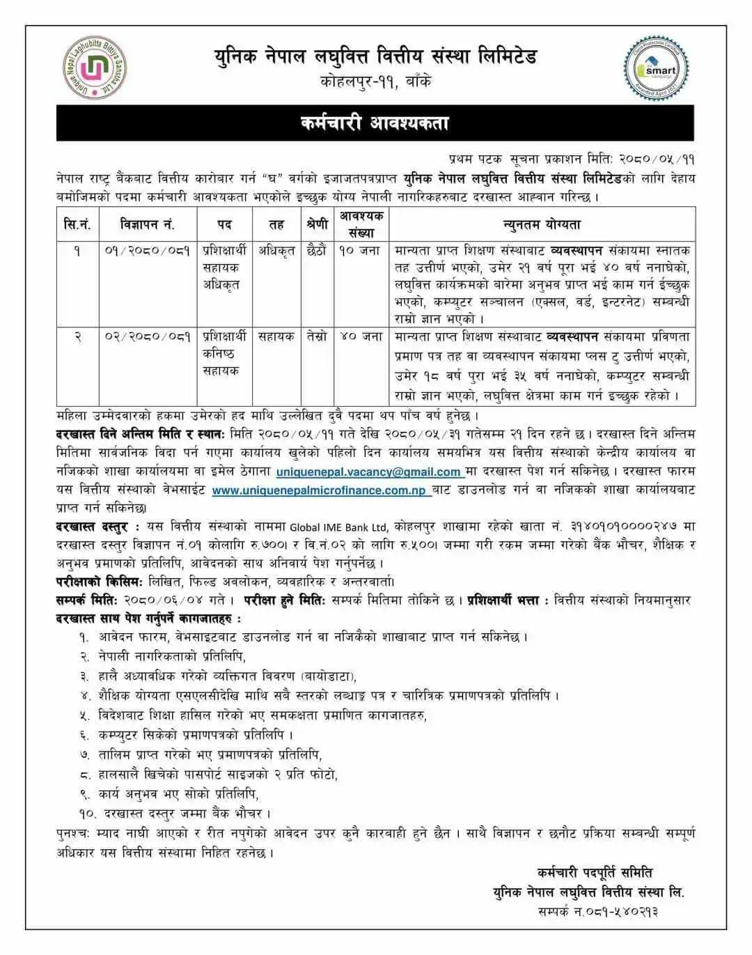 यूनिक नेपाल लघुवित्तमा ५० जनालाई रोजगारी, आवेदन दिने आज अन्तिम दिन