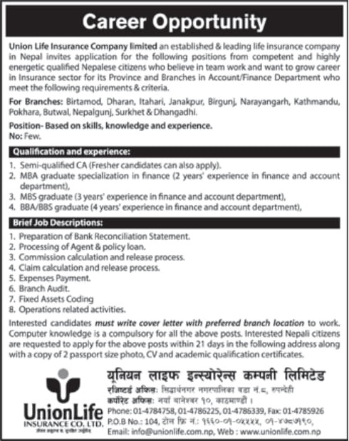 काठमाडौँ । युनियन लाइफ इन्स्योरेन्सले कर्मचारी माग गरेको छ । इन्स्योरेन्सले देशभर रहेका विभिन्न शाखाका लागि कर्मचारी माग गरेको हो ।