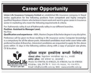 काठमाडौं । यूनियन लाइफ इन्स्योरेन्स कम्पनीले विभिन्न पदका लागि केहि कर्मचारी माग गरेको छ । कम्पनीले असिस्टेन्ट देखि म्यानेजर लेभलको पदका लागि कर्मचारीको माग गरेको हो । कम्पनीले उपत्यका भित्र र उपत्यका बहिरका कार्यालयका लागि कर्मचारी माग गरेको हो ।