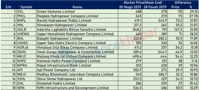 यो साता १८ कम्पनीको शेयर मूल्य १० प्रतिशत भन्दा धेरैले वृद्धि भएको छ । सर्वाधिक शेयर मूल्य वृद्धि हुने १८ कम्पनी मध्ये १५ जलविधुत् कम्पनी छन् । दुई लगानी क्षेत्रका कम्पनी हुँदा एउटा लघुवित्त कम्पनी छ ।