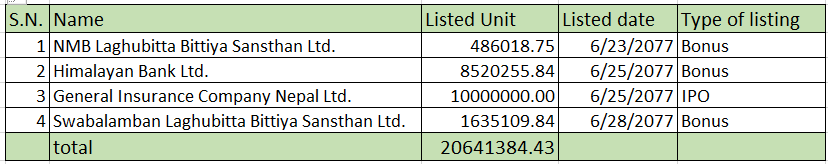 त्यस्तै, स्वावलम्बन लघुवित्त वित्तीय संस्था लिमिटेडको १६ लाख ३५ हजार १ सय ९ दशमलव ८४ कित्ता बोनस शेयर सुचिकृत भएको हो भने एनएमबि लघुवित्त वित्तीय संस्था लिमिटेडको ४ लाख ८६ हजार १८ दशमलव ७५ कित्ता बोनस शेयर सुचिकृत भएको नेप्सेले जनाएको छ ।