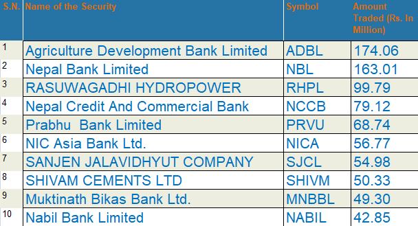 यो साता सबैभन्दा धेरै कृषि विकास बैंकको कारोबार भएको छ । जसको १७ करोड ४ लाख रुपैयाँको कारोबार भएको छ । यो साता टप टन कारोबार हुने कम्पनीहरुमा नेपाल बैंक, रसुवागडी हाइड्रोपावर, एनसीसी बैंक, प्रभु बैंक, एनआइसी एशिया बैंक, साञ्जेन जलविद्युत, मुक्तिनाथ विकास बैंक र नबिल बैंक रहेका छन् ।