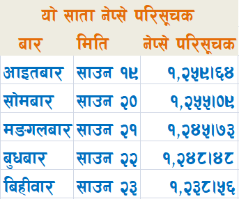 काठमाडौं । बजारमा बिक्री चाप आएसँगै यो साता नेप्से परिसुचक २५ दशमलव २८ अंकले घटेको छ । अघिल्लो साता नेप्से परिसुचक १२६३ दशमलव ८४ को विन्दुमा गएर बन्द भएको थियो भने यो साता नेप्से परिसूचक १,२३८ दशमलव २८ को बिन्दुमा गएर बन्द भएको छ ।