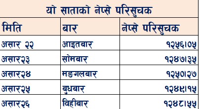 बजारमा बिक्री चाप आए संगै यो साता नेप्से परिसुचक ११ दशमलव ९६ अंकले घटेको छ । अघिल्लो साता नेप्से परिसुचक १२६० दशमलव ५० अंकको विन्दुमा कायम भइ बन्द भएको थियो भने यो साता नेप्से परिसुचक १२४८ दशमलव ५४ अंकको विन्दुमा गएर बन्द भएको छ ।