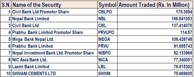 यो साता सिभिल बैंकको प्रोमोटर शेयरको सबैभन्दा धेरै १७ करोड ५३ लाख रुपैयाँको कारोबार भएको छ । यो साता प्रमोटर शेयरको राम्रै कारोवार भएको छ।