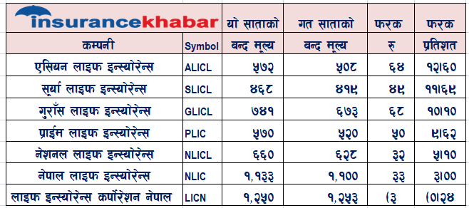 यो साता एसियन लाईफ इन्स्योरेन्सका शेयरधनीले सर्वाधिक १२ दशमलव ६० प्रतिशतले कमाए। एसियन लाईफको अघिल्लो साता ५०८ मा बजार बन्द भएकोमा यो साता एसियन लाईफको प्रति कित्ता ५७२ रुपैयामा बजार मूल्य बन्द भएको छ। त्यस्तै सूर्या लाइफको शेयर मूल्य ११ दशमलव ६९ प्रतिशतले वृद्धि भएको छ। यो साता लाईफ इन्स्योरेन्स कर्पोरेशनको बजार मूल्य मात्र घटेको छ। गत साता १२५३ मा बजार मूल्य बन्द भएकोमा यो साता ३ रुपैया घट्दै प्रति कित्ता १२५० मा बजार मूल्य बन्द भएको छ।