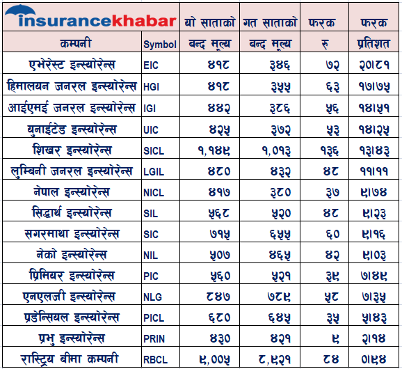 यो साता एभरेस्ट इन्स्योरेन्सका शेयरधनीले सर्वाधिक २० दशमलव ८१ प्रतिशतले कमाए। एभरेस्ट इन्स्योरेन्सको अघिल्लो साता ३४६ मा बजार बन्द भएकोमा यो साता एभरेस्ट इन्स्योरेन्सको प्रति कित्ता ४१८ रुपैयामा बजार मूल्य बन्द भएको छ। त्यस्तै हिमालयन जनरल इन्स्योरेन्सको शेयर मूल्य १७ दशमलव ७५ प्रतिशतले वृद्धि भएको छ।