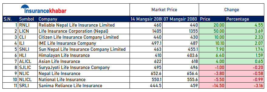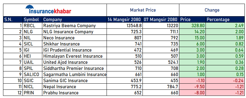 निर्जीवन बीमा तर्फ राष्ट्रिय बीमा कम्पनीको शेयर मूल्य सातामा सर्वाधिक २ दशमलव ४९ प्रतिशतले वृद्धि भएको छ। गत साता १३ हजार २२० रुपैयाँ रहेको कम्पनीको बजार मूल्य यो साता १३ हजार ५४८ दशमलव ८० पुगेको छ । त्यस्तै दोश्रोमा एनएलजी इन्स्योरेन्सको शेयर मूल्य २ प्रतिशतले वृद्धि भएको छ । यो साता निर्जीवन बीमा तर्फ ९ कम्पनीको शेयर मुल्य बढेको छ भने ३ कम्पनीको शेयर मूल्य घटेको छ ।
