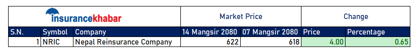 त्यस्तै नेप्सेमा सूचीकृत एक मात्र पुनर्बीमा कम्पनी नेपाल पुनर्बीमा कम्पनीको शेयर मूल्य सामान्य शून्य दशमलव ६५ प्रतिशतले वृद्धि भएको छ ।