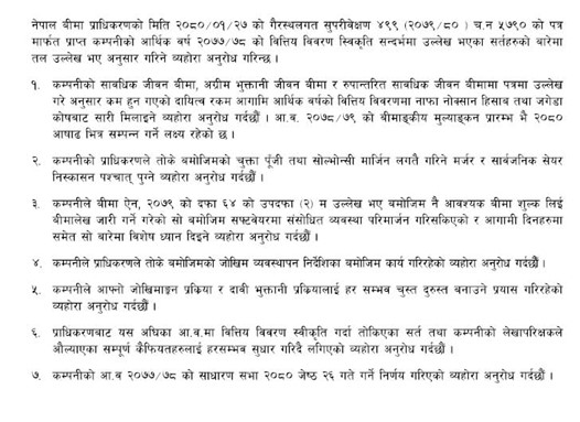 नेपाल बीमा प्राधिकरणका कार्यकारी निर्देशक राजुरमण पाैडेलले प्राधिकरणले सशर्त वित्तीय विवरण स्वीकृत गरेकाे अवस्थामा शर्त पालना नगरी वित्तीय विवरण साधारण सभामा लैजान नमिल्ने बताए । उनले भने, याे कारवाहीकाे विषय हाे, प्राधिकरणले यस विषयमा आवश्यक निर्णय लिनेछ। यस बारेमा थप जानकारी लिन सिइओ भट्टराईलाई सम्पर्क गर्दा मोबाइल अफ गरेर बसेका छन् भने कम्पनीका सूचना अधिकारी कमल पन्थी सम्पर्कमा आएनन्।