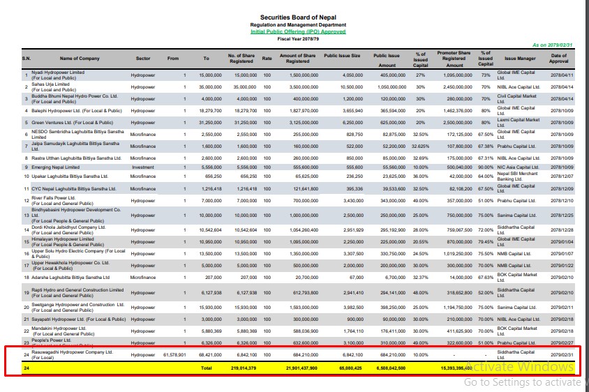 कम्पनीले ६८ लाख ४२ हजार १०० कित्ता आइपीओ निष्काशन गर्न सेबोनबाट अनुमति पाएको हो । विक्री प्रबन्धक सिद्धार्थ क्यापिटल लिमिटेड रहेको छ ।