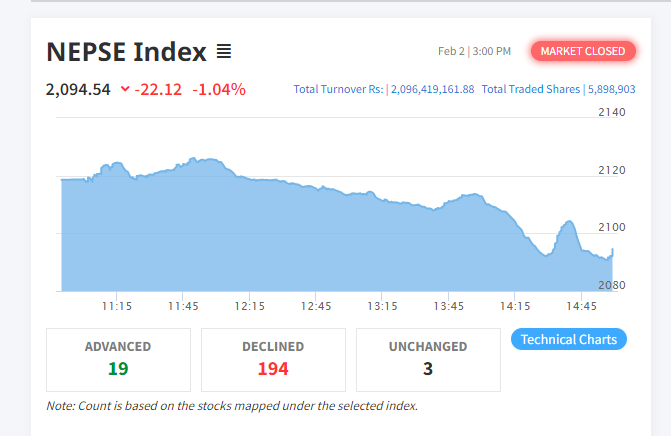 बिहीबार नेप्से सूचक २२.१२ अंकले घटेर २०९४.५४ अंकमा झरेको छ । सूचक सँगै कारोबार रकम पनि २ अर्ब ९ करोडमा सिमित भएको छ । आज सम्पुर्ण सूचक तथा उपसूचकमा गिरावट आएको छ । १९४ वटा कम्पनीको शेयर मूल्यमा गिरावट हुँद जम्मा १९ कम्पनीको शेयर मूल्यमा सुधार देखिन्छ ।