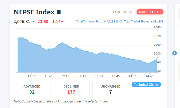 यसै क्रममा साताको पहिलो कारोबार सुरु हुने वित्तीकै घट्ने क्रम सुरु भएको थियो । सोमबार नेप्से सूचक २३.६० अंकले घटेर २०४६.८१ अंकमा रोकिएको छ । कारोबार रकम एक अर्ब ९४ करोडमा सिमित भएको छ । दिनभर कारोबारमा तिव्र उतारचढाव देखियो । कारोबारको अन्तिम समयमा केहि बाउन्स व्याक हुने क्रममा कारोबार रकम बढ्न थालेको थियो । तर सूचक २३.६० अंकको गिरावट सहित बन्द भयो ।