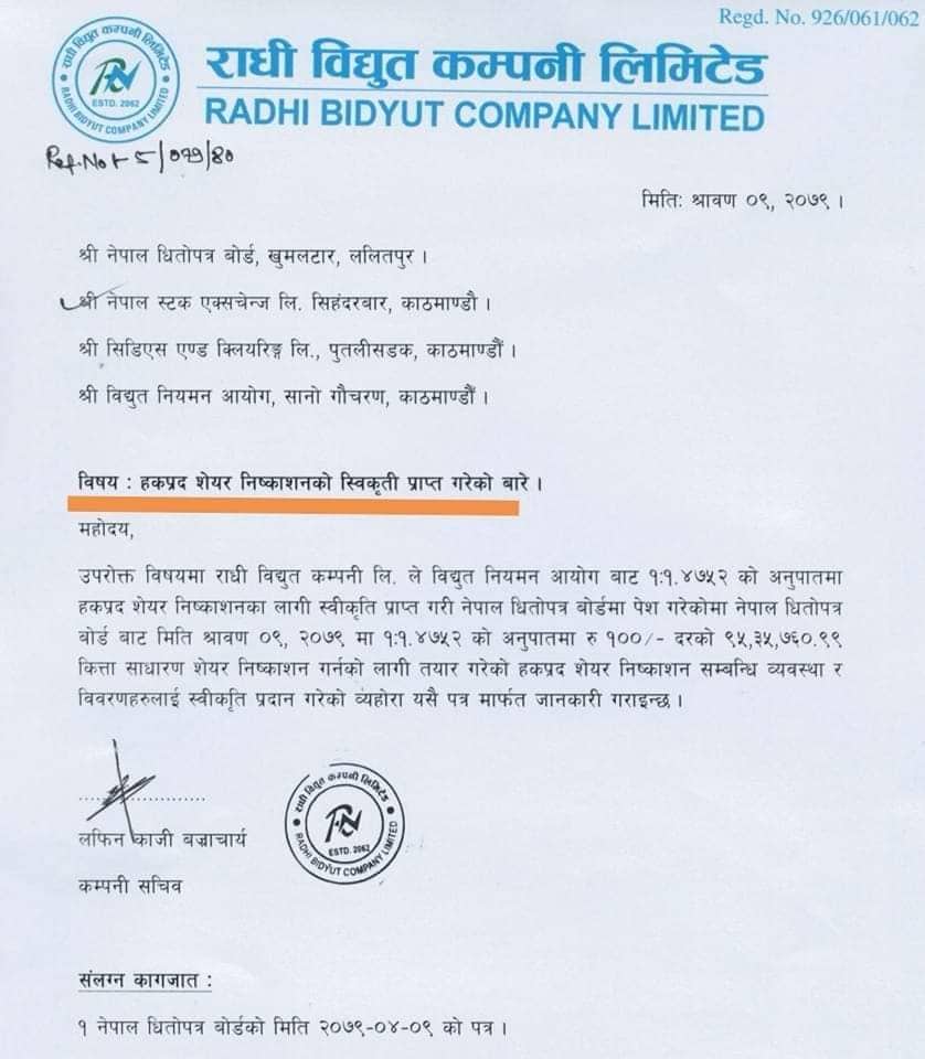 काठमाडौं । राधि विद्युत कम्पनीले हकप्रद शेयर निष्काशनको अनुमति प्राप्त गरेको छ । नेपाल धितोपत्र बोर्डले कम्पनीद्याई एक बराबर १.४७४२ को अनुपातमा हकप्रद शेयर निष्काशनका लागि स्वीकृति दिएको हो । कम्पनीले विद्युत नियमन आयोगबाट अनुमति लिएर बोर्डमा स्वीकृतिका लागि पेश गरेको थियो ।