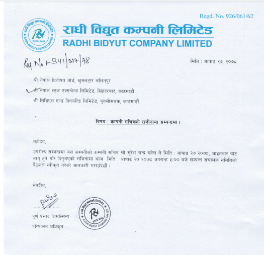काठमाडौं । राधी विद्युत कम्पनी लिमिटेडका कम्पनी सचिव सुरेश चन्द्र खरेलले राजिनामा दिएका छन् । असार २७ गते कम्पनी सचिवबाट खरेलले राजिनामा दिएका हुन् ।