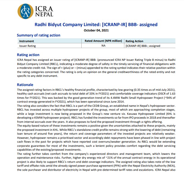 काठमाडौं । राधी विद्युत् कम्पनीले इक्रा नेपालमा रेटिङ गराएको छ । इक्रा नेपालले कम्पनीलाई इक्रा आईआर त्रिपल बी माइनस रेटिङ प्रदान गरेको हो । उक्त रेटिङले समयमा वित्तीय दायित्व पुरा गर्ने सम्बन्धमा मध्यम मात्रामा सुरक्षित रहेको देखाउँछ ।