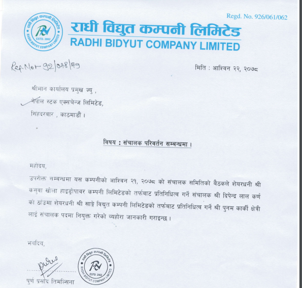काठमाडौं । राधी विद्युत् कम्पनीमा सञ्चालक परिवर्तन भएका छन् ।कम्पनीका शेयरधनी कसुवाखोला हाइड्रोपावर कम्पनी लिमिटेडको तर्फबाट प्रतिनिधित्व गर्ने सञ्चालक दिपेन्द्र लाल कर्णको ठाउँमा शेयरधनी साङ्गे विद्युत् कम्पनी लिमिटेडको तर्फबाट पुनम कार्की क्षेत्रीलाई सञ्चालक पदमा नियुक्त गरेको जनाएको छ । कम्पनीले एक सुचना जारी गर्दै यस्तो जनाएको हो ।