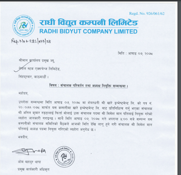 साथै,असार ७ गते बसेको सञ्चालक समितिको बैठकले मंगलावरदेखि लागू हुने गरी कम्पनीको अध्यक्ष पदमा बिमेश मान पतिलाई नियुक्त गरेको जनाएको छ ।