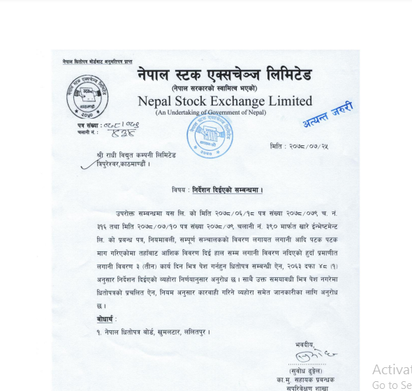 काठमाडौं । नेपाल स्टक एक्सचेञ्जले राधी विद्युत् कम्पनी लिमिटेडलाई तीन दिनभित्र लगानी विवरण पेश गर्न निर्देशन दिएको छ । नेप्सेले राधी विद्युत् कम्पनीको लगानी रहेको खारे इन्भेष्टमेन्टको प्रबन्धपत्र, नियमावली र सम्पूर्ण सञ्चालकहरुको विवरण र सञ्चालकहरुले गरेको लगानीको विवरण माग गरेको हो ।
