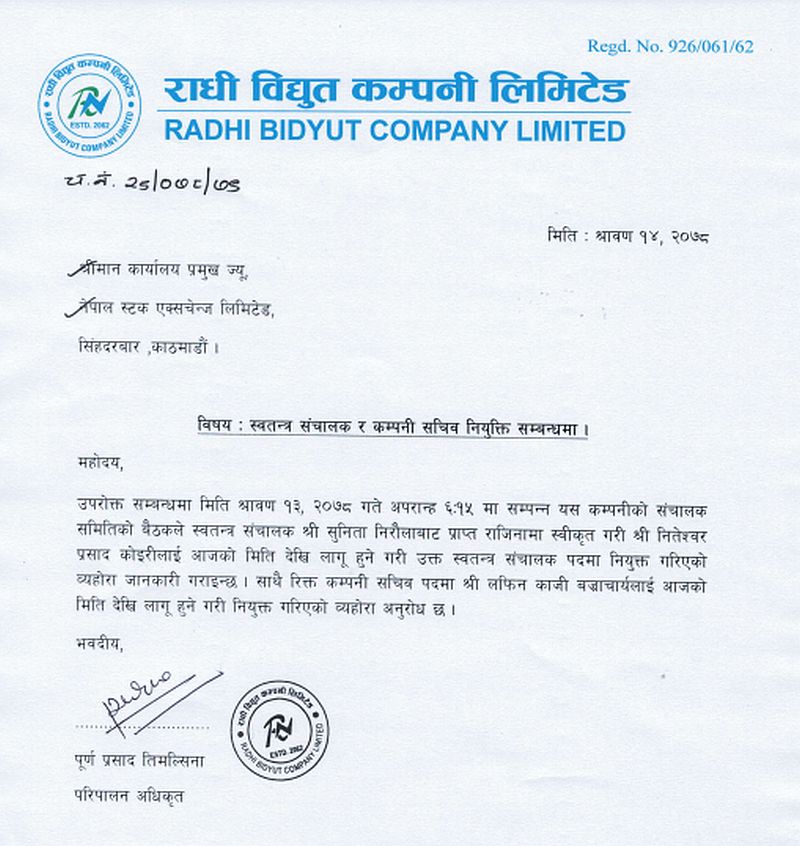 काठमाडौं । राधी विद्युत कम्पनीको स्वतन्त्र सञ्चालकमा नितेश्वर प्रसाद कोइरी र कम्पनी सचिवमा लफिन काजी बज्राचार्य नियुक्त भएका छन् । कम्पनीको साउन १३ गते बसेको सञ्चालक समितिको बैठकले स्वतन्त्र सञ्चालक सुनिता निरौलाले दिएको राजिनामा स्वीकृत गरी नितेश्वर कोइरीलाई आजदेखि लागू हुने गरी स्वतन्त्र सञ्चालकमा नियुक्त गरेको हो ।