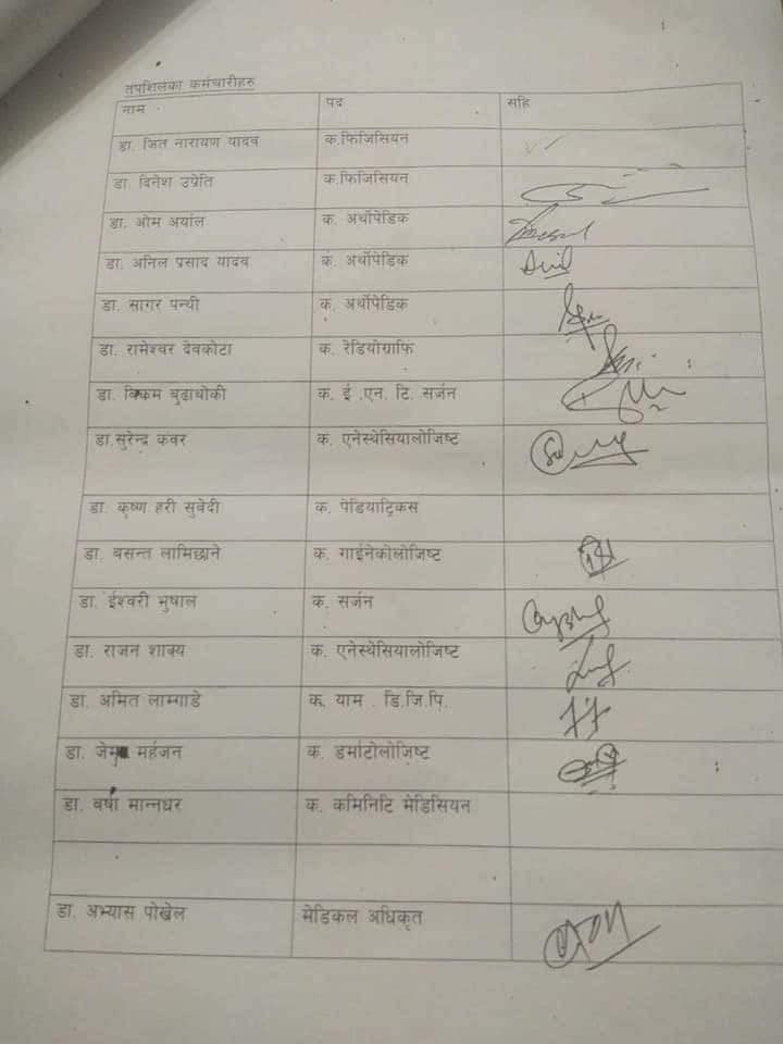 राजिनामा दिने मेडिकल अधिकृतहरु डा. अभ्यास पोखरेल, डा. कृष्ण रिजाल, डा. गौरव आचार्य, डा. अनिल खाम, डा. धना केसी, डा. प्रितम डिसी, डा. राजेन्द्र फुलारा, डा. आयुष पौडेल उपाध्याय, डा. सुर्वण बुढा र डा. मनोज यादव रहेका छन् ।