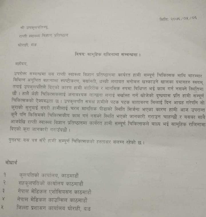 काठमाडौं । दाङको घोराहीस्थित राप्ती स्वास्थ्य विज्ञान प्रतिष्ठान (राप्ती उपक्षेत्रीय अस्पताल) मा कार्यरत सबै डाक्टरहरुले व्यवस्थापनप्रति असन्तुष्टी जनाउँदै आज विहान सामूहिक राजिनामा दिएका छन् ।
