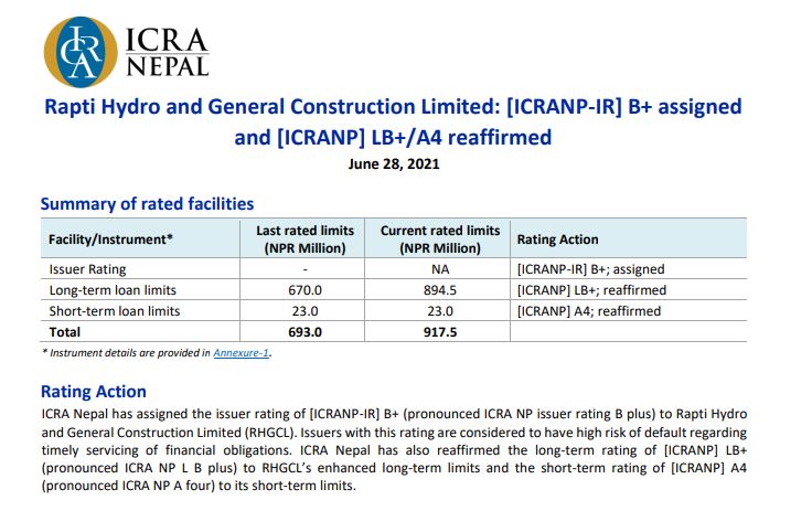 काठमाडौं । राप्ती हाइड्रो एण्ड जनरल कन्स्ट्रक्सन लिमिटेडलाई रेटिङ एजेन्सी इक्रा नेपाल लिमिटेडले रेटिङ प्रदान गरेको छ । इक्राले कम्पनीलाई वित्तीय दायित्व पूरा गर्न चुक्ने सम्बन्धमा उच्च जोखिम मानिने (इक्रा–आईआर) बी प्लस निष्काशनकर्ता रेटिङ प्रदान गरेको हो ।