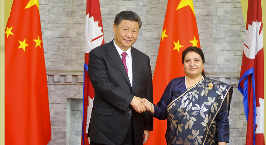 काठमाडौं । शनिबार दुई दिने राजकीय भ्रमणमा नेपाल आएका चिनियाँ समकक्षी सी जिनपिङलाई स्वागत गर्न राष्ट्रपति विद्यादेवी भण्डारी अपरान्ह विमानस्थल पुगिन् । विमानस्थलमा चिनियाँ राष्ट्रतिको स्वागत गर्दा कलेजी रंगको ब्लाउज र सुनौलो रंगको सारी लगाएकी भण्डारीले साँझ शितलनिवासमा औपचारिक भेटवार्ता गर्दा भने अर्कै पोशाकमा थिईन् ।