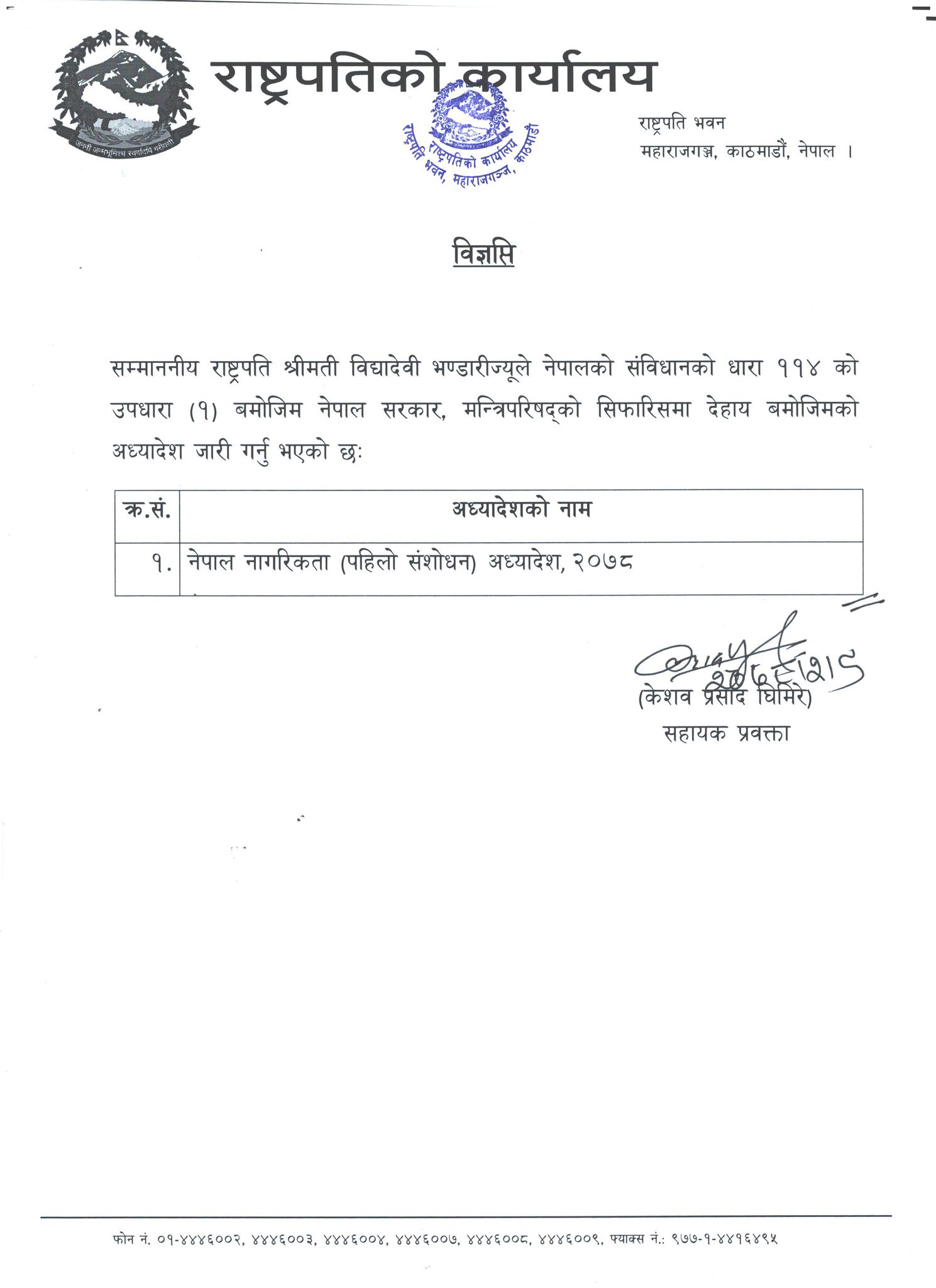 काठमाडौं । राष्ट्रपति विद्यादेवी भण्डारीले नेपाल नागरिकता (पहिलो संशोधन) अध्यादेश जारी गरेकी छन् । नेपालको संविधान धारा ११४ को उपधारा १ बमोजिम नेपाल सरकार, मन्त्रिपरिसदको सिफारिस बमोजिम अध्यादेश जारी भएको हो ।