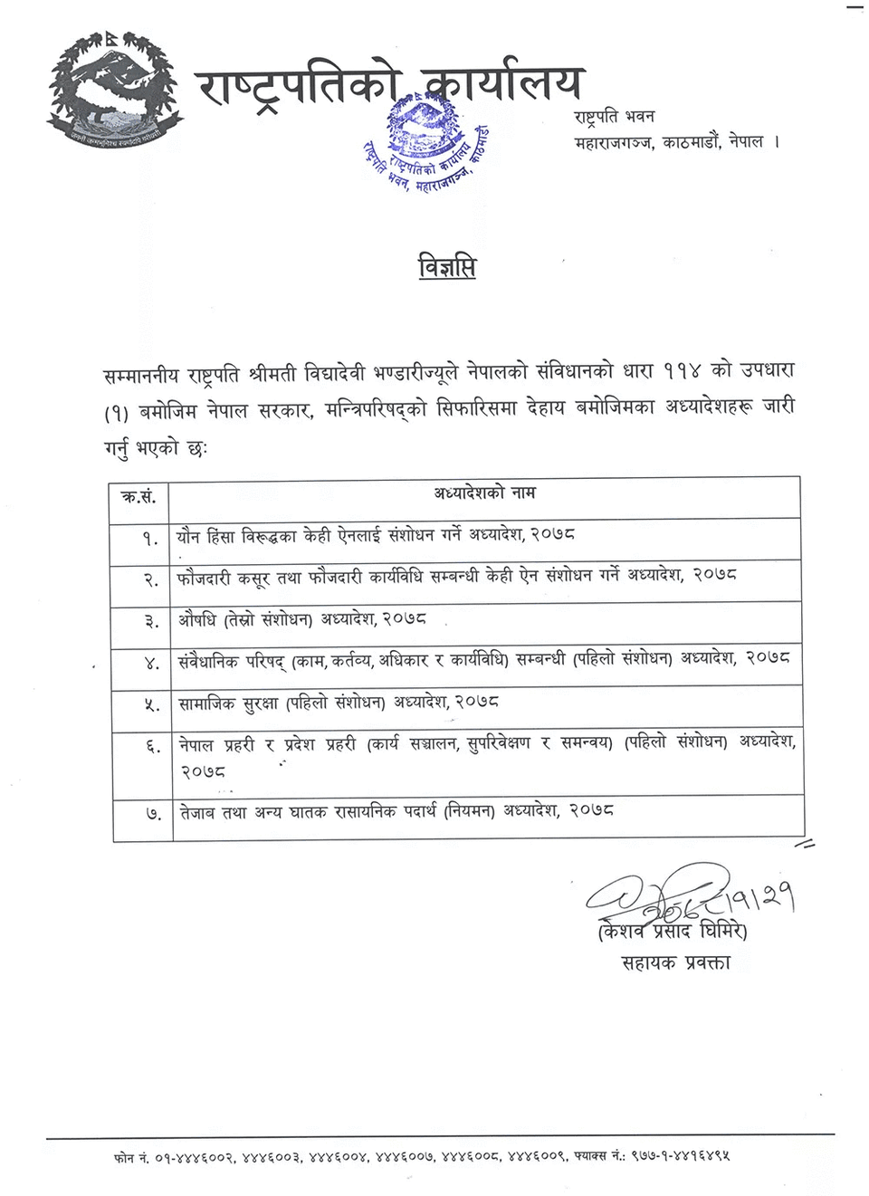 आज जारी अध्यादेशमा यौन हिंसा विरूद्धका केही ऐनलाई संशोधन गर्ने अध्यादेश, २०७८, फौजदारी कसूर तथा फौजदारी कार्यविधि सम्बन्धी केही ऐन संशोधन गर्ने अध्यादेश, २०७८, औषधी (तेस्रो संशोधन) अध्यादेश, २०७८, सामाजिक सुरक्षा (पहिलो संशोधन) अध्यादेश, २०७८, नेपाल प्रहरी र प्रदेश प्रहरी (कार्य सञ्चालन, सुपरिवेक्षण र समन्वय) (पहिलो संशोधन) अध्यादेश र तेजाब तथा अन्य घातक रासायनिक पदार्थ (नियमन) अध्यादेश, २०७८ छन् ।