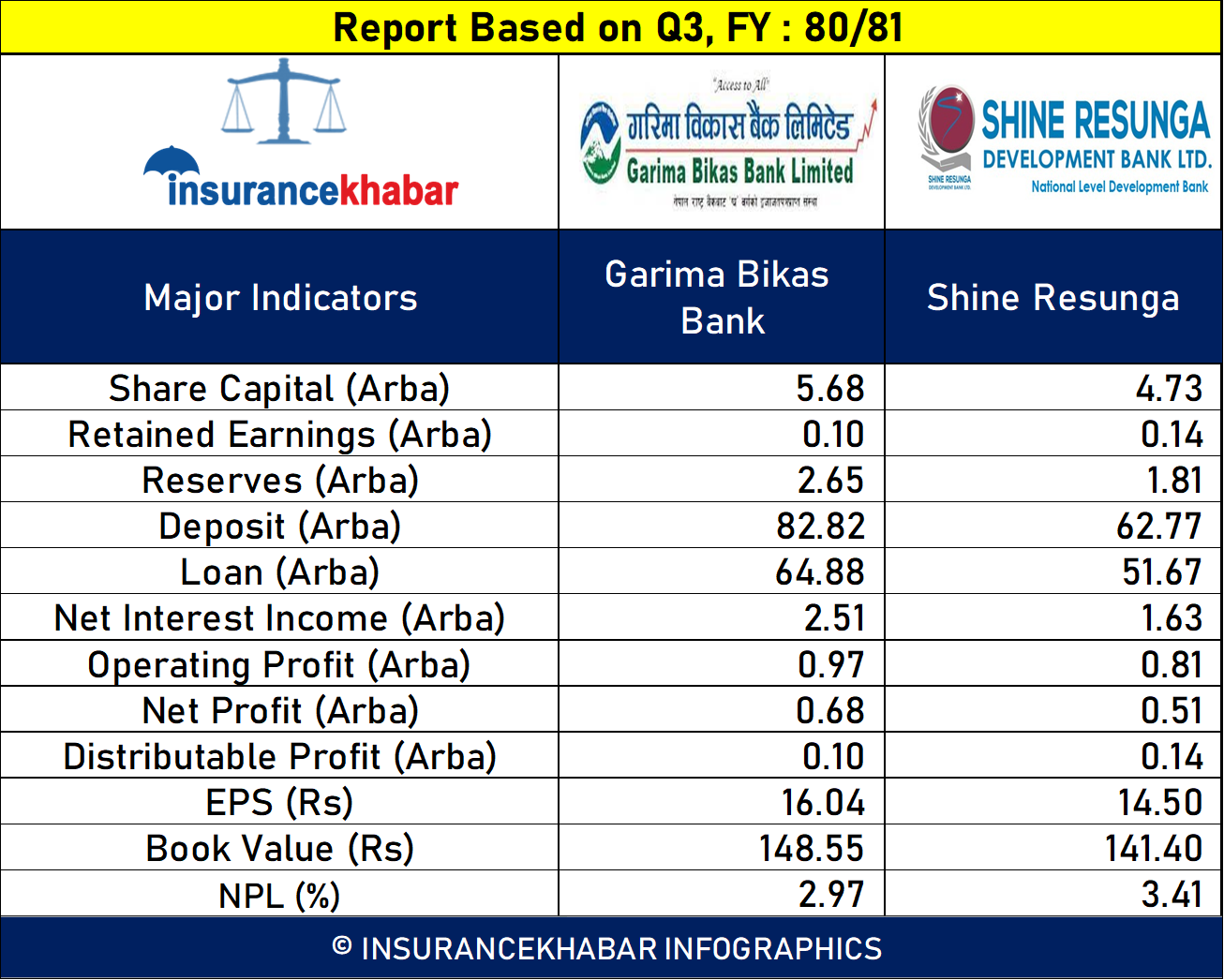 बैंकहरुले प्रकाशन गरेको आर्थिक वर्ष २०८०।८१ को तेस्रो त्रैमासको वित्तीय विवरणका आधारमा गरिमाले ८२ अर्ब ८२ करोड रुपैयाँ निक्षेप संकलन गरी ६४ अर्ब ८८ करोड रुपैयाँ कर्जा प्रवाह गरेको छ भने शाइन रेसुङ्गाले ६२ अर्ब ७७ करोड रुपैयाँ निक्षेप संकलन गरी ५१ अर्ब ६७ करोड रुपैयाँ कर्जा प्रवाह गरेको छ।