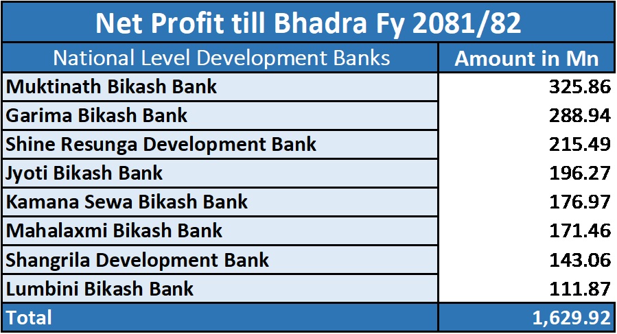 नेपाल राष्ट्र बैंकले आज सार्वजनिक गरेको तथ्यांकअनुसार राष्ट्रियस्तरका ८ वटा विकास बैंकले दुई महिनामा १ अर्ब ६२ करोड ९९ लाख रुपैयाँ नाफा आर्जन गरेका हुन्। यो अवधिमा सर्वाधिक नाफा कमाउने विकास बैंकमा मुक्तिनाथ रहेको छ। मुक्तिनाथले यो दुई महिनामा ३२ करोड ५८ लाख रुपैयाँ नाफा आर्जन गरेको छ।
